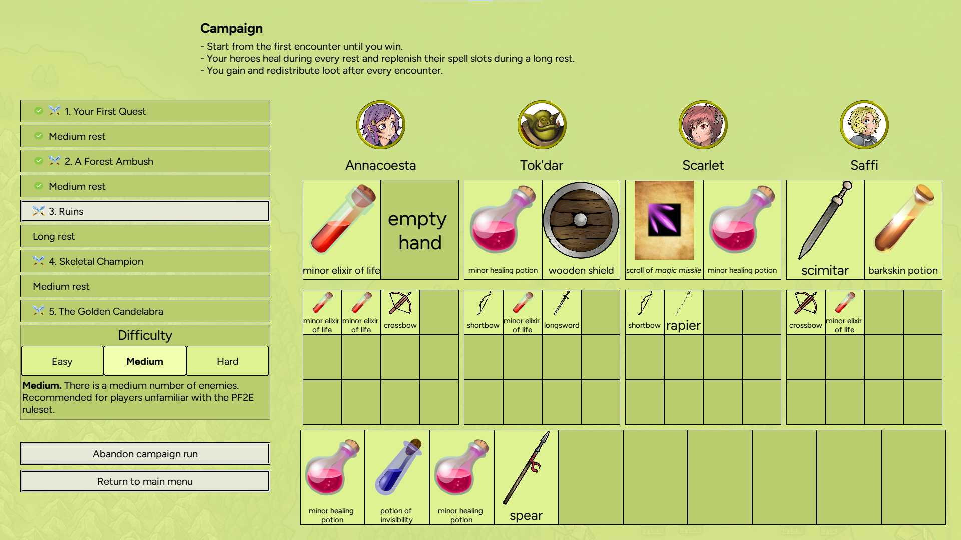 Quest for the Golden Candelabra is a 2D turn-based tactics game based on the rules of PF2E, the second edition of a powerful tabletop OGL ruleset. You lead a group of four colorful characters through a series of encounters, fighting against monsters, acquiring loot and eventually -- hopefully -- recovering the ancient artifact that's the object of your quest.